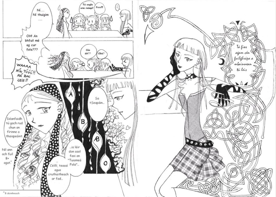 Interesting the things one stumbles across on the idirlíon / internet. All I can say is, give this girl a contract and lets have some manga as Gaeilge!