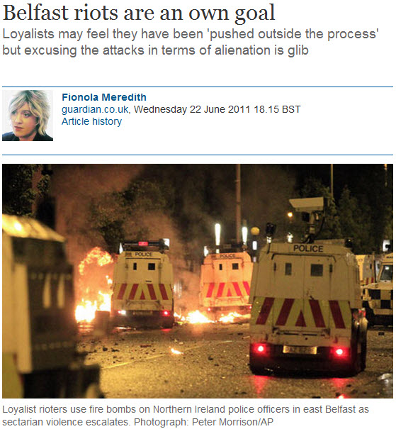 Journalist Fionola Meredith in the Guardian on some of the background to the UVF-led Unionist attacks on the Nationalist Short Strand enclave in East Belfast over the last two nights. In her opinion (echoed by others) the recent appearances of new Unionist paramiltary wall murals, banners and flags in parts of the city show that: