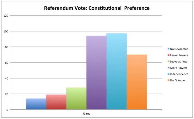 ‘…an appetite amongst Welsh voters for making progress on a wide-ranging constitutional agenda… Presenting the data at a seminar in Cardiff Bay Professor Roger Scully, of the Institute of Welsh Politics, emphasised that the wide gap between the relatively few Yes supporters in the survey who were against making further progress on more powers and the large majority who wanted to go further was unprecedented in findings of this kind. He said that in more than a decade of analysing such data he had never come across such a wide divergence.’