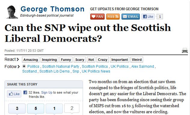 Some time ago I predicted the virtual demise of the British Liberal Democrat Party in Scotland following the poor results it recorded in the recent Scottish parliamentary elections, and it seems the mainstream British media has finally caught up with me. Well, the Huffington Post (UK Ltd!), which I suppose is sort of British – and media.