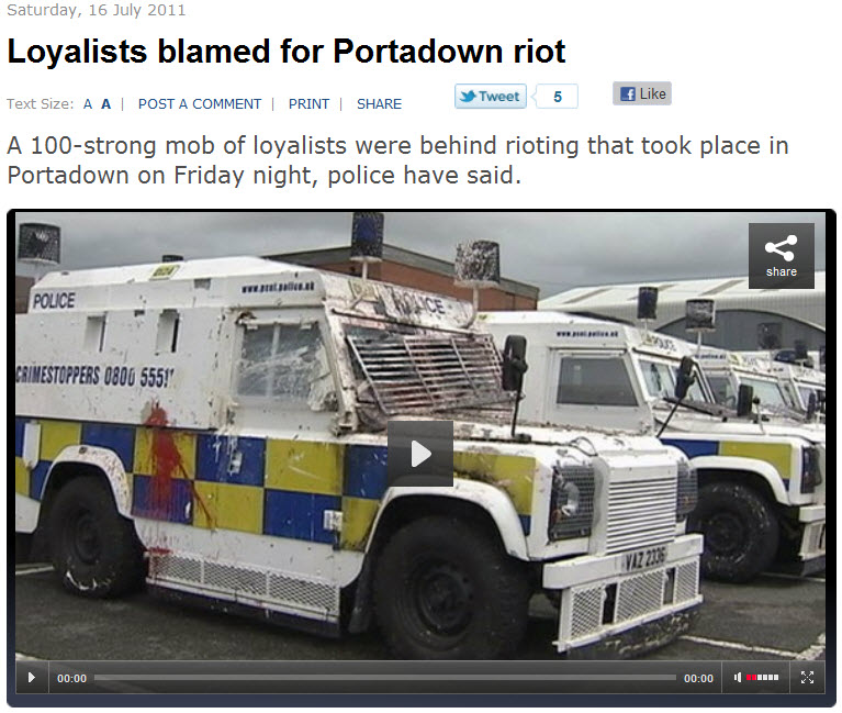 It has been reported that at least 100 British Unionist rioters were involved in overnight clashes in the contested town of Portadown, as they attempted to attack the homes of the local Irish Nationalist community. Using the excuse of the removal of British flags by local families with the agreement of the PSNI (the paramilitary police force) in an effort to ease communal tensions, British militants gathered in the area, armed with petrol bombs and other improvised weapons, and proceeded to attack both the PSNI and Irish civilian families. According to UTV: