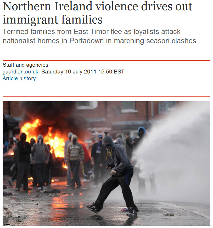 ‘Immigrant families from East Timor fled a Catholic area of Northern Ireland on Friday night when loyalist rioters tried to attack nationalist homes, a Sinn Fein councillor said today.