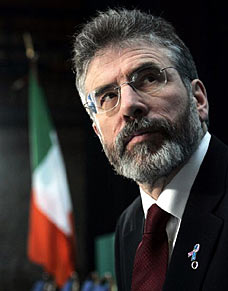 On the other side is Martin McGuinness M.P. and M.L.A., Joint First Minister of the North of Ireland (or Deputy First Minster of Northern Ireland, depending on your politics) and the party’s chief strategist in seemingly making the British Occupied North of Ireland a tolerable place for Irish citizens to live in while on the road to a reunited Ireland. From the Guardian: