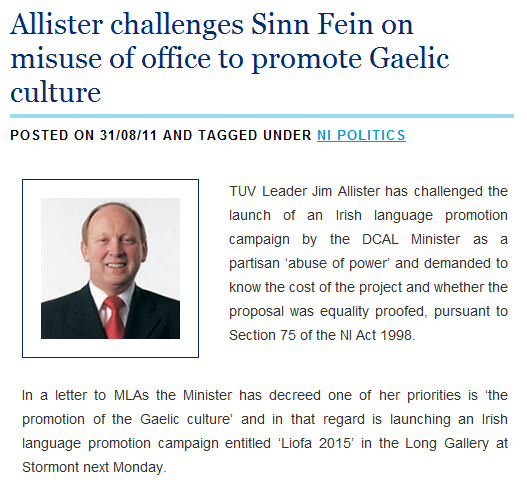 Thanks to Daithí for drawing my attention to this latest bit of nonsense from TUV leader Jim Allister, as he yet again rails against any attempt to implement linguistic or cultural equality between the