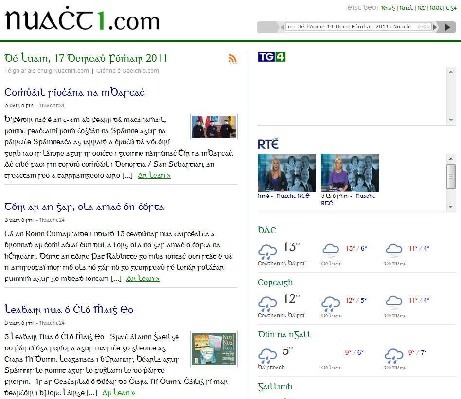 Irish news aggregator Nuacht1 is available in both the Irish and English languages but the most interesting version is the third option, one in the Irish alphabet Seanchló. It’s really nice to see this version and what may have been had we not made the move from our traditional alphabet to the (boring!) Western Latin one in the 1950s. If the Greeks and Israelis could survive with their native scripts…