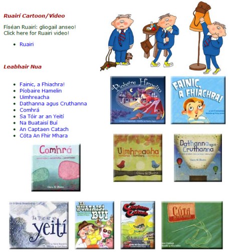 All these titles are available from the publishers or from Litríocht, the “Irish Amazon”, whose bilingual website features a huge range of Irish books, e-Books, CDs, DVDs and many other items, all shipping internationally. Or try Cló Iar-Chonnacht for another large range of Irish materials.