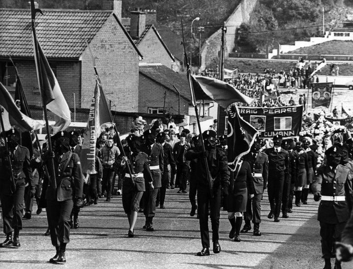 Volunteers of the Derry Brigade of the Irish Republican Army parade through Derry City, British Occupied North of Ireland, 1970s