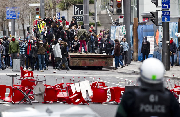 The chanting march had not gone far before pyrotechnical devices were thrown and were followed near the downtown core by beer bottles. Police flooded Ste-Catherine Street, the city’s commercial core where chain stores sit side-by-side with upscale boutiques and told everyone to get off the streets or face arrest for participating in a riot.