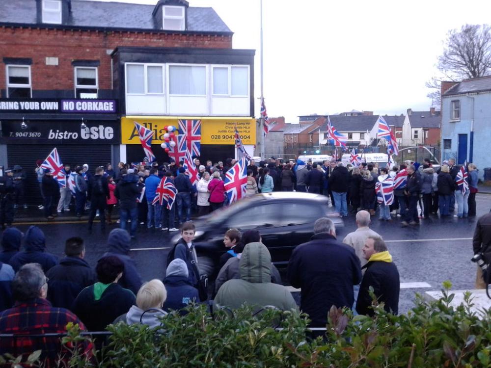 British Unionist protesters besiege the offices of the liberal Unionist Alliance Party in east Belfast, Ireland 2012 (Photo: The Five Demands)