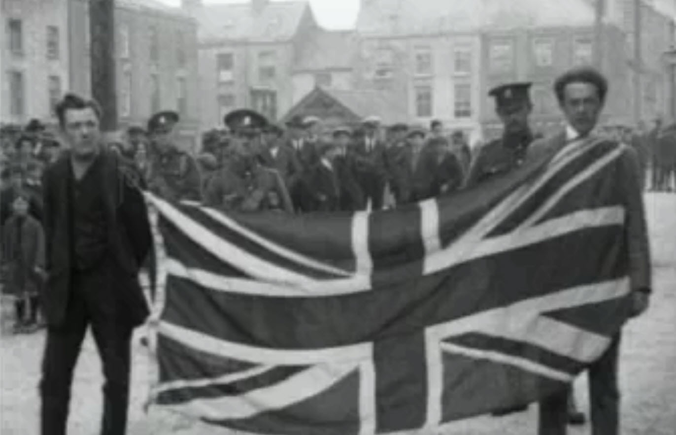 Two Irishmen forced to parade around Dungarvan by British troops with a British flag tied around their necks. Both were later beaten and dumped outside the town. The War of Independence, Ireland, 1920