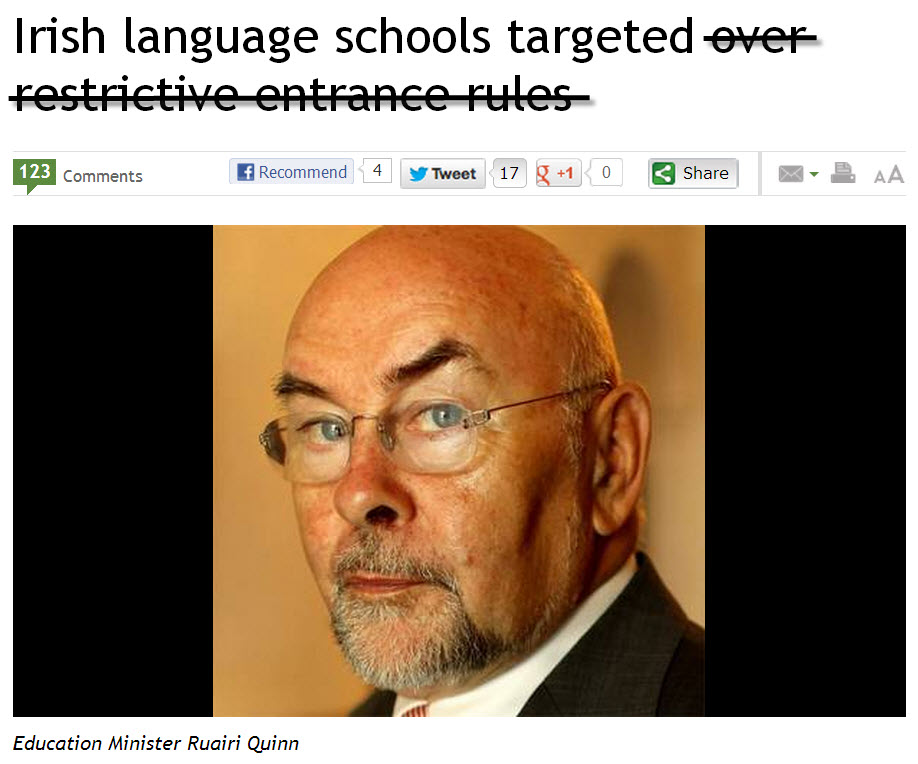 Thanks, Jack, appreciate the kind words and your support. Your analysis is spot on. Are we in Ireland 2013 or 1913? These colonial attitudes are the very things that are holding this nation in a sort of cultural Ice Age, circa. 1900. Every little sign of progress is leaped upon. Irish medium schools are flourishing so they are now a regular target in the news media and by online Anglophone bigots.