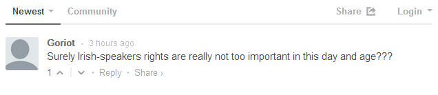 In response to yesterday’s surprise resignation by the Language Rights Commissioner Seán Ó Cuirreáin, an act of protest against the culture of Anglophone discrimination towards Hibernophones that pervades the Irish state and government, this comment left on the website of the Irish Independent newspaper sums up the reaction of many English-speakers in Ireland.
