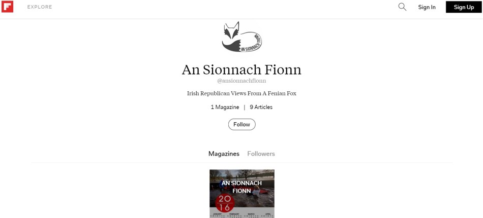 Just a quick post to let readers know that An Sionnach Fionn is now available for users of Flipboard, the popular free mobile app which collects content (articles) from selected websites and social media platforms and presents them in the style of a digital magazine for smartphones, tablets and PCs. To add my blog to your reading list simply sign into your Flipboard desktop account and pop over to my profile, @AnSionnachFionn, or you can search for ASF using the terms, An Sionnach Fionn or AnSionnachFionn. If you prefer you can add the RSS feed from the blog instead, using the above search terms or alternatively typing in, https://ansionnachfionn.com/feed. Of course you can use the app itself on your mobile device to do all of the above as well. I have been using Flipboard for the last few years and can attest to its usefulness for keeping abreast of new articles and posts from your favourite webzines.