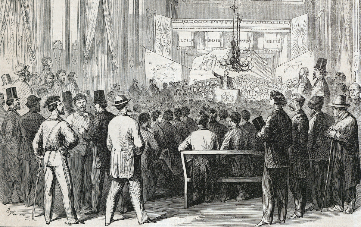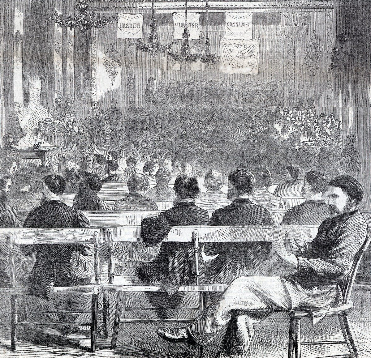 In the latter half of 1865, the Fenian Brotherhood of America (FBA), the formerly clandestine Irish revolutionary organisation in the United States and Canada, spent the modern equivalent of some $3.5 million dollars on moving its headquarters from a modest address at 22 Duane Street, New York City, to a prestige location at Moffat Mansion, 32 East 17th Street, Union Square, Manhattan, next to the popular Everett House Hotel. The enormous costs involved in the leasing and outfitting of the substantial brownstone building, owned by a leading Scottish-American doctor called John Moffat, led to much rancour and debate within the movement. However many in the FBA’s leadership justified the move by pointing to the resolutions of the 3rd General Convention of the Fenian Brotherhood of America, held in October 1865 at the Assembly Building in the city of Philadelphia, Pennsylvania.