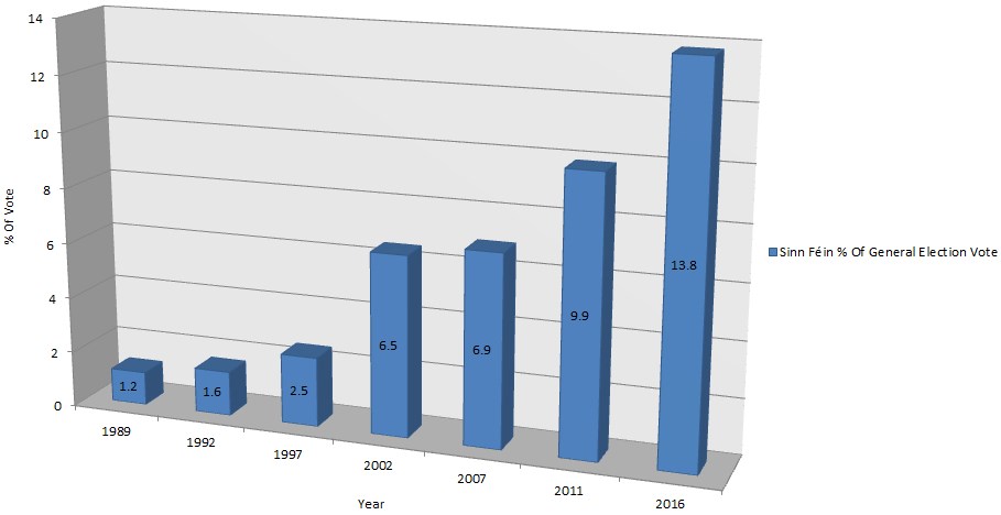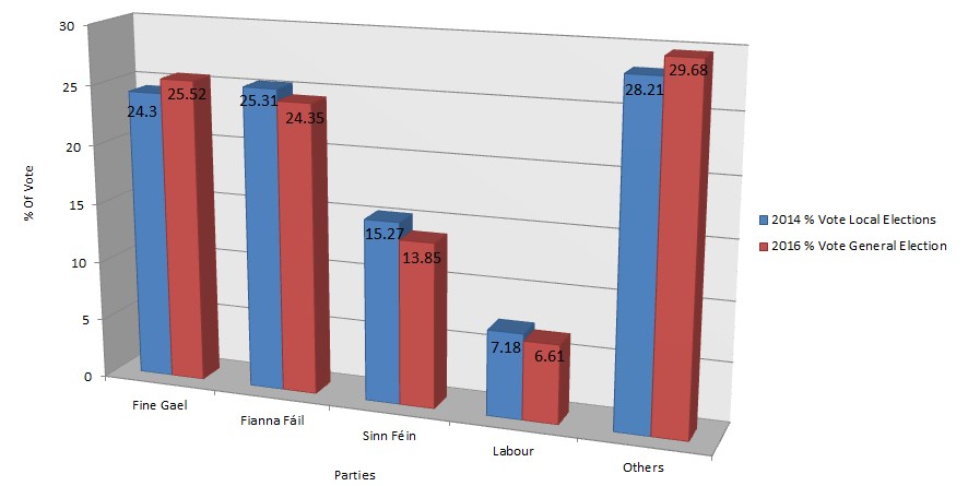 Again, a foreshadowing of this could be seen in the local elections of 2014 where SF took 159 seats on 15% of the vote, a staggering increase of 105 councillors. At the time most press observers attributed Sinn Fein’s success to votes “loaned” to it by disgruntled supporters of Fianna Fáil and the Labour Party. However defying the expected wisdom of the experts the majority of those votes did not return to their former political homes in this month’s general election, particularly among those who formerly favoured Labour. Instead having made the jump to SF many voters decided to stay there come ballot day. It should be noted that it was not all smiles for Sinn Féin as the party narrowly missed out on at least five more seats, largely through internal vote mismanagement or failing to win the required transfers. Pádraig Mac Lochlainn and Trevor Ó Clochartaigh were two unnecessary losses. Another 6% of first preference votes and the party would be returning thirty or more deputies to An Dáil.
