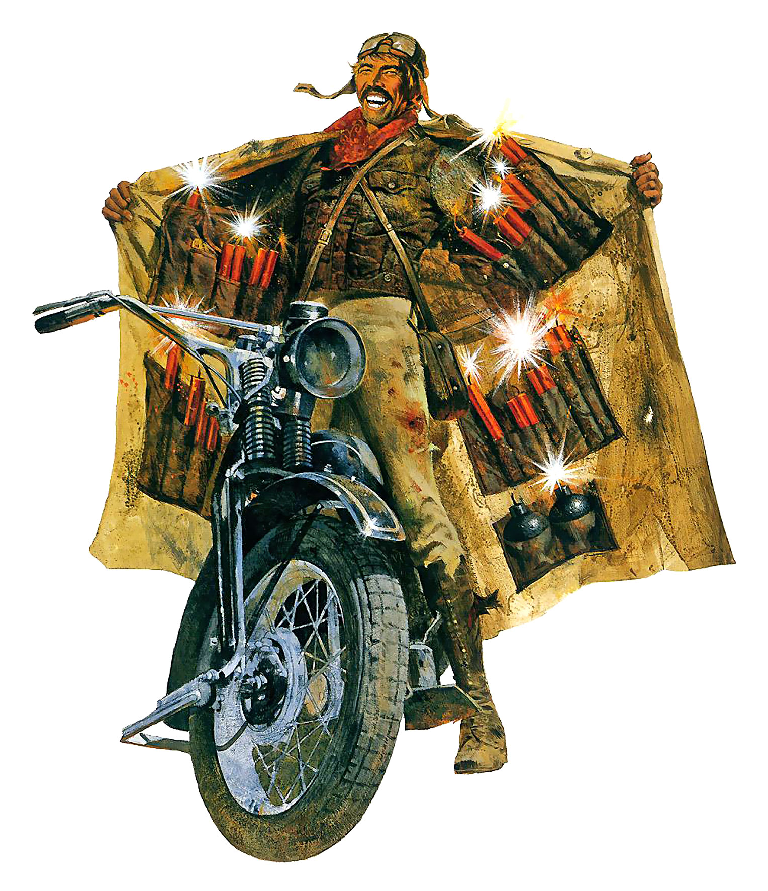 Featured below is a wonderfully over-the-top poster from the great American illustrator, Robert E. McGinnis, showing the character of the Fenian dynamiter John “Seán” Mallory astride his beloved motorbike. I have searched for a poster-size version of this movie artwork for years, not to mention desiring to have it on a tee-shirt. Though, admittedly, that might be thought impolitic in this day and age given the explosive imagery. Quite literally.