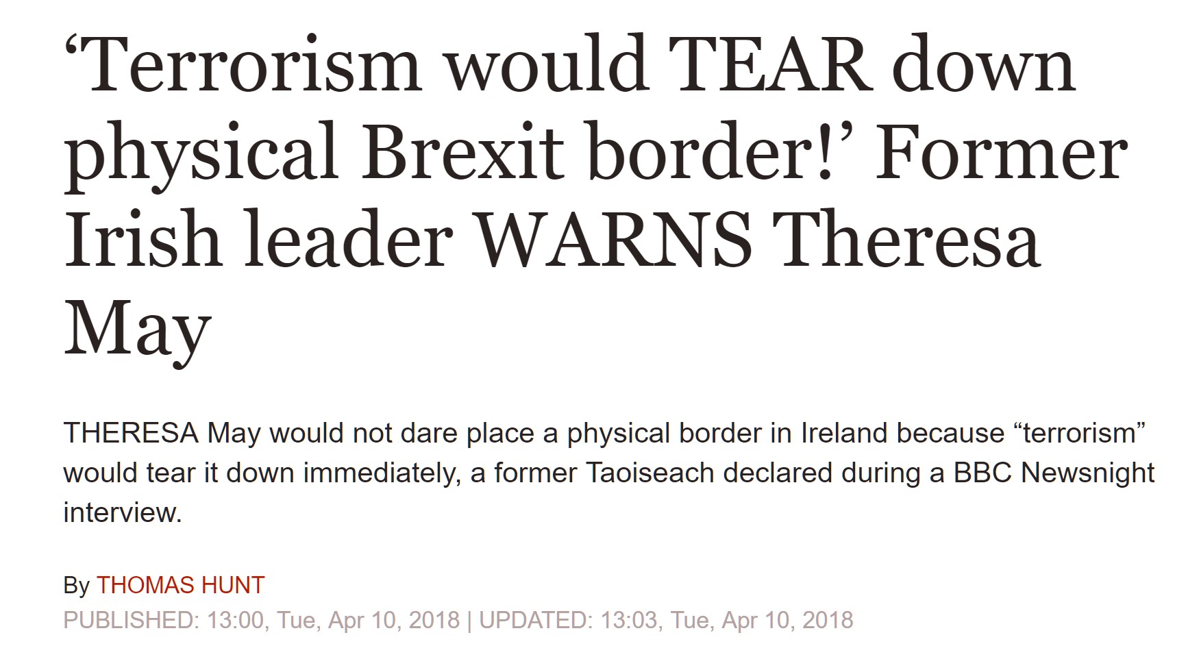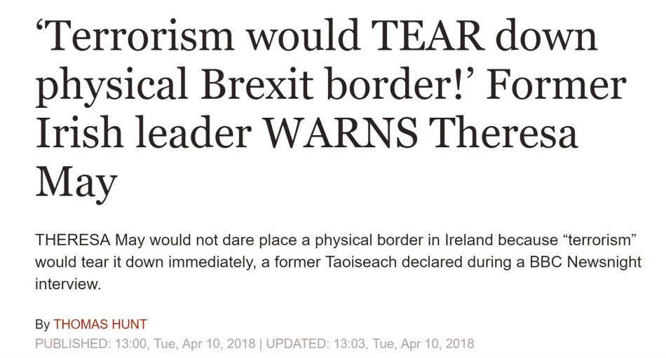 THERESA May would not dare place a physical border in Ireland because “terrorism” would tear it down immediately, a former Taoiseach declared during a BBC Newsnight interview.