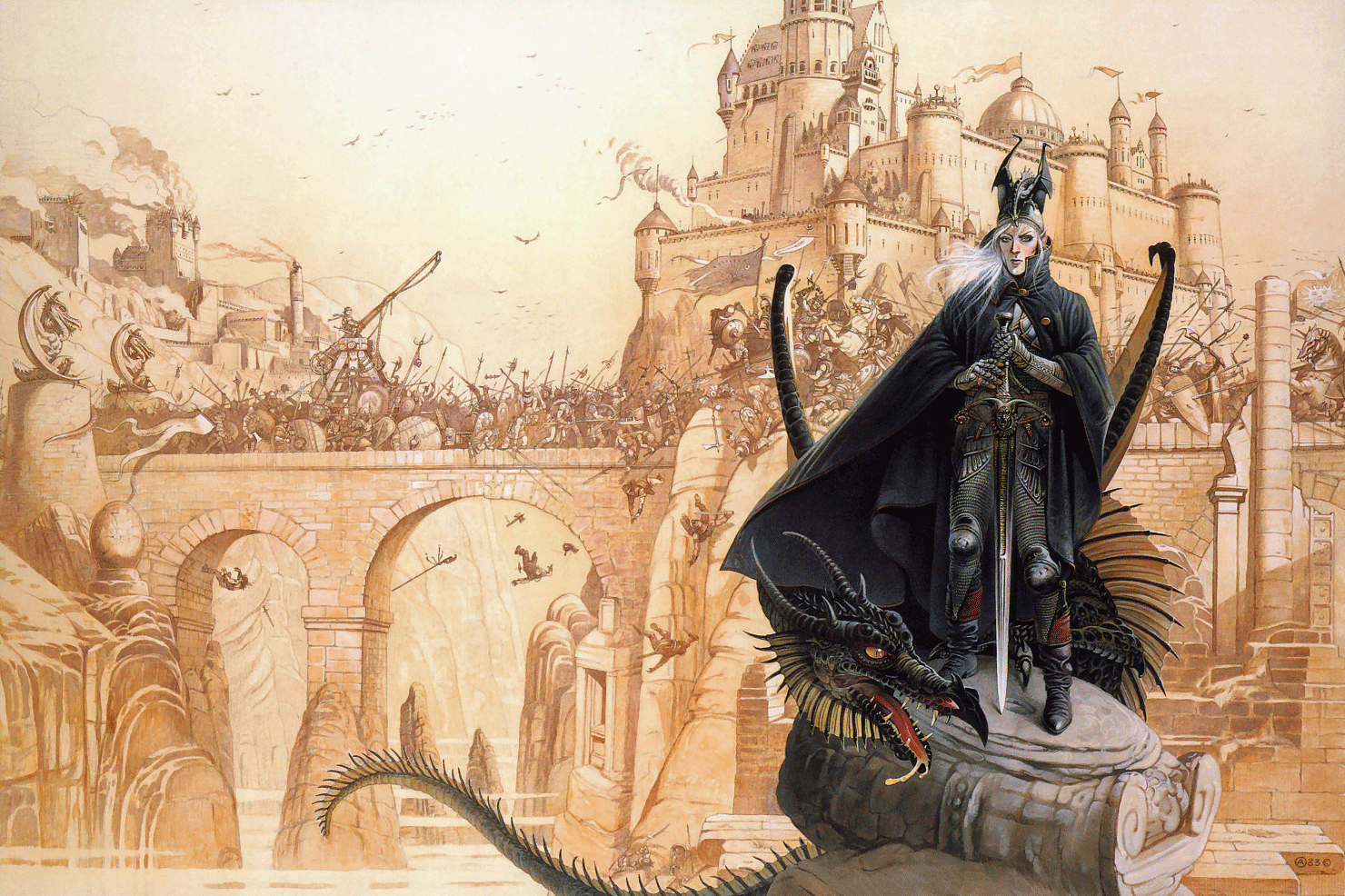 “Elven Warrior” a wraparound cover illustration by Chris Achilléos for Michael Moorcock’s “Elric at the End of Time” (Íomhá: © 1983 Chris Achilléos)